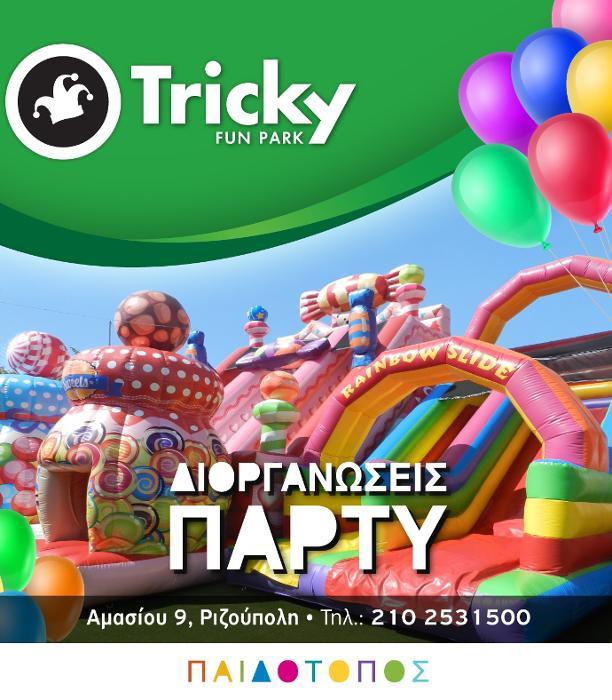 Ο παιδότοπος Tricky Fun Park διαθέτει φουσκωτά παιχνιδια, παιχνιδοκατασκευές, μπαλοπισίνες, τραμπολίνο, baby kart, snack cafe και αναλαμβάνει διοργάνωση παιδικών πάρτι, πάρτυ γενεθλίων, οργάνωση παιδικού παρτυ κ.α.