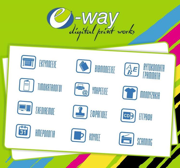 Το κατάστημα E Way με ψηφιακές εκτυπώσεις αναλαμβάνει φωτοτυπίες, εκτύπωση τιμοκαταλόγου, σχεδιασμός δημιουργικού, ημερολόγια, βιβλιοδεσίες, υπηρεσίες εκτύπωσης, σφραγίδες, εκτύπωση σε κούπες, αυτοκόλλητα γράμματα, εκτύπωση σε μπλούζες, έγγραφα CD, scanning, πλαστικοποιήσεις, επαγγελματικές κάρτες, έγχρωμες ψηφιακές εκτυπώσεις, μονόχρωμες ψηφιακές εκτυπώσεις κ.α.