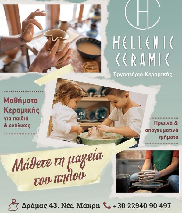 Το εργαστήριο κεραμικής Hellenic Ceramic αναλαμβάνει μαθήματα κεραμικής για παιδιά, μαθήματα κεραμικής για ενήλικες, πηλοπλαστική, αγγειοπλαστική και διαθέτει κεραμικά για δώρα, κεραμικά δώρα για γάμους, κεραμικά δώρα για βάπτιση κ.α. εξυπηρετώντας Νέα Μάκρη, Μαραθώνας, Ζούμπερι, Ντράφι, Βουτζάς κ.α.