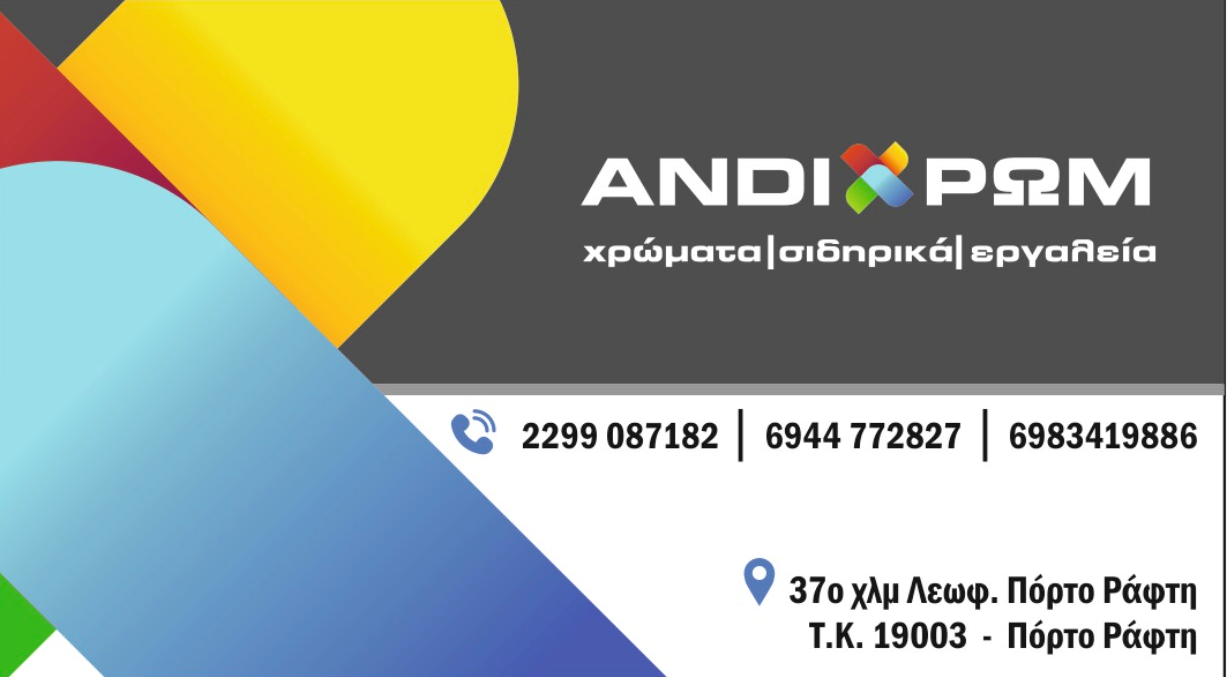 Το κατάστημα με χρώματα - σιδηρικά ANDIΧΡΩΜ διαθέτει χρώματα και βερνίκια (Vivechrom, Vechro, Caparol, Isomat, ΧΡΩΤΕΧ, ΝΕΟΤΕΧ), υδραυλικά είδη, μονωτικά υλικά (NEOTEX, ALCHIMICA, ISOMAT, DUROSTIC, SIKA), όλα σκόνες/Σοβάδες/Κόλλες (ISOMAT, DUROSTICK, SIKA, KELYFOS), οικοδομικά υλικά (αμμοχάλικα, τσιμέντα, ασβέστης, μαρμαρόσκονη, άμμος θαλάσσης, άμμος ποταμίσια), θερμοπρόσοψη (ΚELYFOS-ISOMAT, Caparol), ναυτιλιακά είδη (μοράβια, ανοξείδωτα εξαρτήματα, πάστες, γυαλιστικά, σφραγιστικά - SIKA), κάρβουνα, υγραέριο, φιάλες υγραερίου Coral, ηλεκτρολογικό υλικό, ηλεκτρικά εργαλεία (Black & Decker, Krausmann, Dewalt) κ.α.