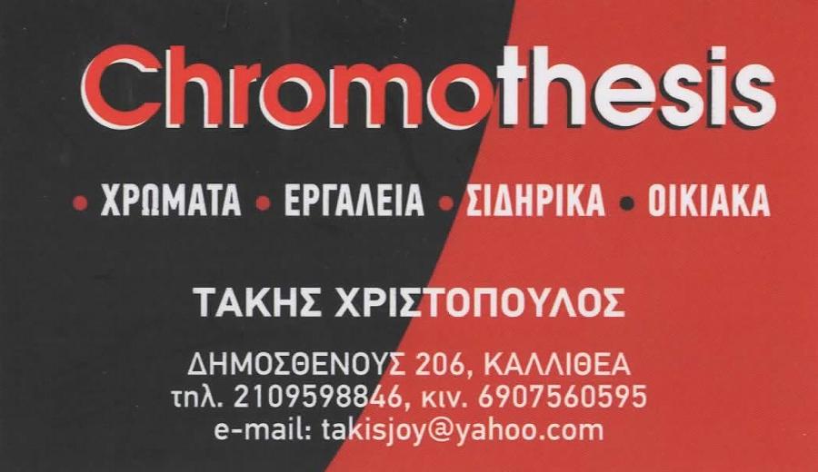 Το χρωματοπωλείο Chromothesis διαθέτει σιδηρικά (συνδετικά, γωνίες, βίδες, πόμολα), χρώματα (αστάρια, Χρώματα Vitex, Πλαστικά χρώματα, λαδομπογιές), υδραυλικά είδη (αποχετεύσεις, υδρορροές, λάστιχα, ρακόρ), μονωτικά υλικά, στεγανωτικά υλικά, μονωτικά ταρατσών, είδη κήπου, ξυλουργικά εργαλεία, πριόνια, ηλεκτρικά εργαλεία, οικοδομικά εργαλεία, υδραυλικά είδη, οικιακά είδη (πλέγματα, κόλλες, κρεμάστρες), εργαλεία, κλειδιά κ.α. εξυπηρετώντας Καλλιθέα, Ταύρος, Μοσχάτο και γύρω περιοχές.