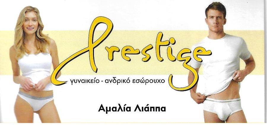Το Κατάστημα Εσωρούχων Prestige διαθέτει ανδρικά μαγιό, γυναεικεία μαγιό, εσώρουχα ανδρικά, εσώρουχα γυναικεία σουτιέν, ρόμπες, πιτζάμες, νυχτικά, καφτάνια, καλσόν, φόρμες ανδρικές, φόρμες γυνακείες, κολάν, κομπινεζόν, παντόφλες, φανελάκια, κορμάκια, sexy εσώρουχα κ.α.