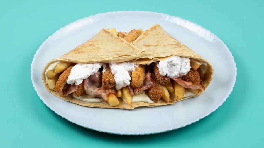 Κρέπα gouda, μπέικον ψημένο, φέτα, κοτοκροκέτες & Quick sauce