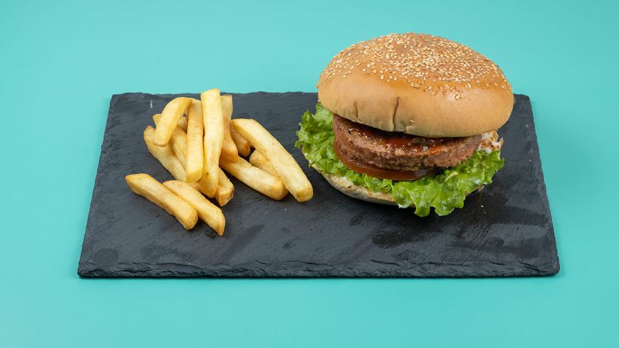 Κρέπα gouda, μπιφτέκι, πατάτες, ντομάτα & σως κόκκινη